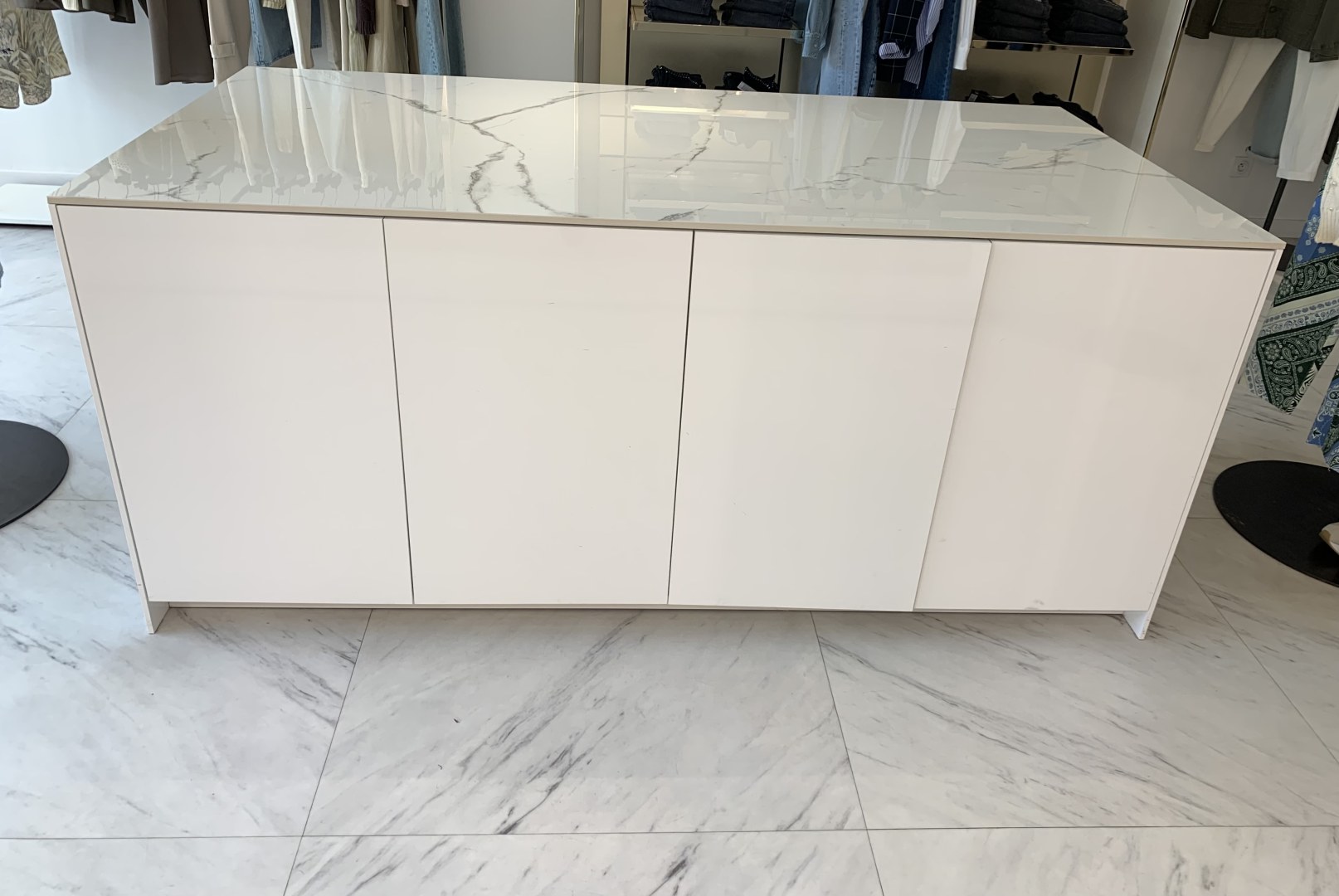 Meuble îlot central avec rangement 2 étagères de chaque côté avec porte push pull (8portes), plateau en marbre blanc, Socle aluminium. Très bon état neuf. Coloris laqué blanc. Création sur mesure par cuisiniste haut gamme Minimaliste CUCQ. Facture achat à l appuis. Possibilité usage professionnel le ou particulier .