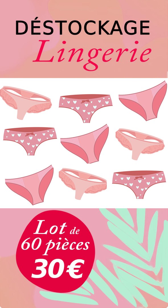 Nous vous proposons des lots de 60 culottes, boxers et strings à prix fous ! Vous retrouverez dans vos lots des assortiments de bas de lingerie de plusieurs couleurs, style et tailles. L.dessous, grossiste depuis 2004 vous propose des offres de déstockage toute l'année, n'hésitez pas à nous rejoindre et à passer vos commandes sur www.lingerie-grossiste.fr inscription gratuite !