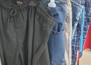 Other products are also available: sweaters, shirts, jackets, dresses, shoes, and belts — for men, women, and children.