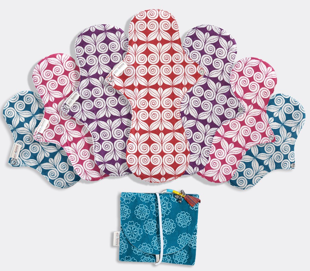 Starter Kits : 1 kit comprend 2 protège-slips, 2 serviettes hygiéniques de jour, 2 serviettes hygiéniques de jour Plus, 1 serviette hygiénique de nuit, 1 pochette de transport, des instructions/conseils d'entretien et un tableau de suivi du cycle menstruel.