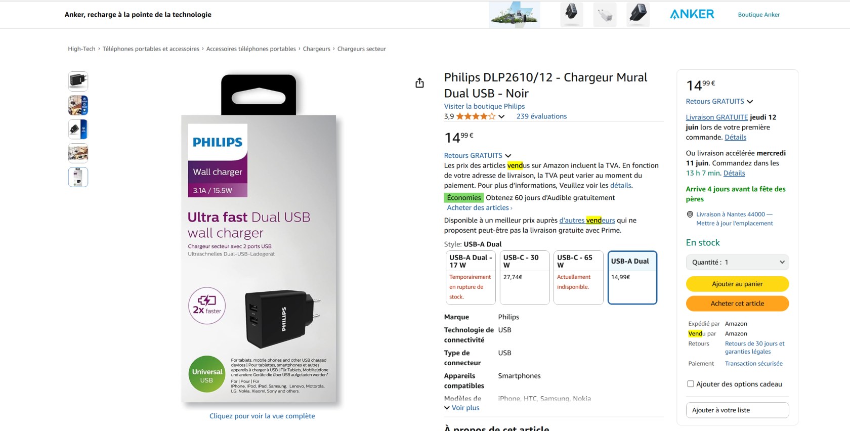 Chargeur mural philips dual usb – neuf – stock important – vente par lot