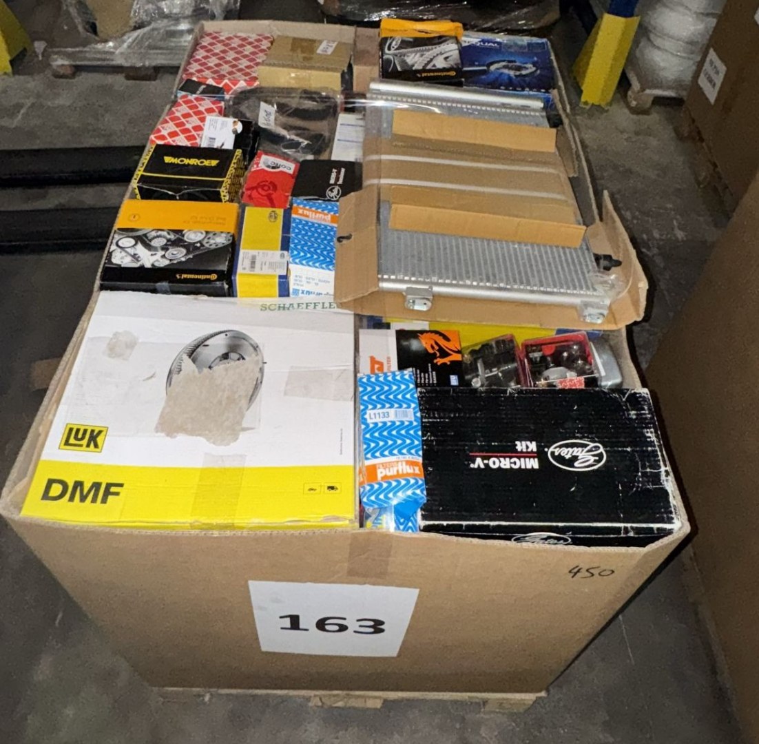 Palette composée de diverses pièces détachées automobiles, pouvant contenir sans garantie les éléments suivants : Démarreurs, alternateurs, turbos, amortisseurs, plaquettes de frein, kits d'embrayage, jantes, filtres, ampoules, avertisseurs, courroies, disques de frein, produits d'entretien, kits de distribution, supports moteur, supports boîte, vannes EGR, triangles, lève-vitres, lave-vitres, etc. Pour plus d'information contactez-nous au : Fixe : 02 32 69 13 89. Portable ...