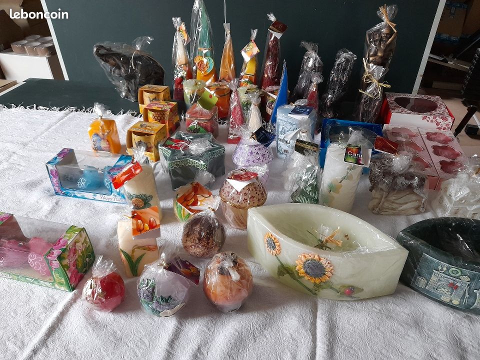 Vends environ 200 bougies parfumées et décoratives. De différentes formes, grandeurs, couleurs et senteurs. exemple figurine comme éléphant, oiseaux et autre , ainsi que de nombreuses bougies décoratives pour noel . Idéal pour un revendeur. 600 euros le lot A retirer sur place ou possible envoi frais en plus par petite palette.