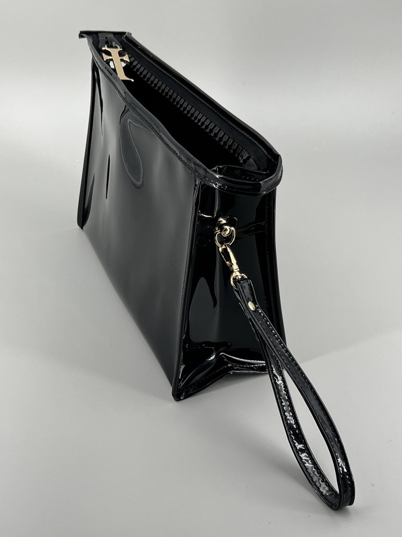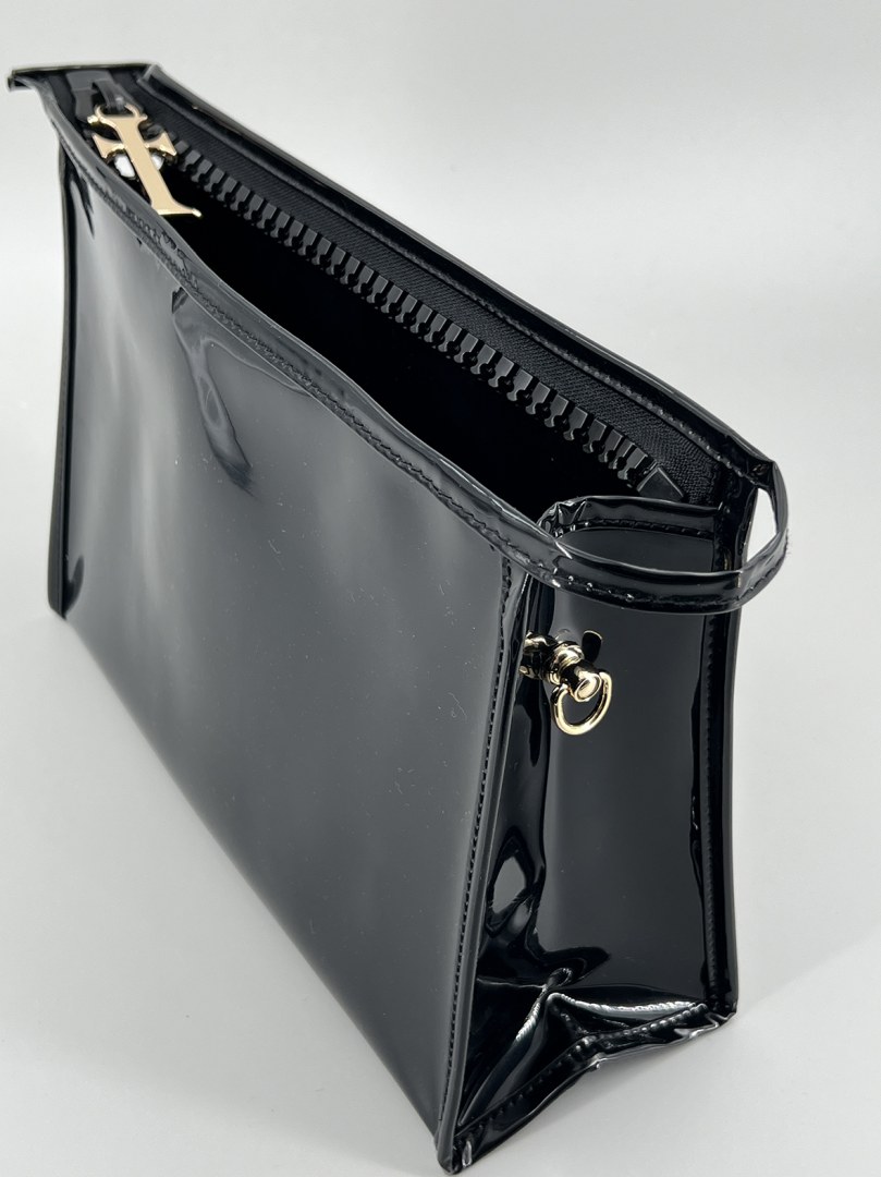 Trousse vinyle noir, sac soirée, zip XXL, finition dorée, tirette croix dorée