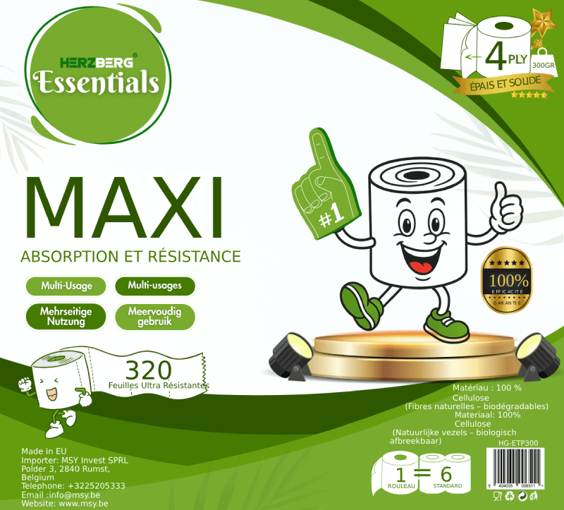 Choose maximum performance with the Herzberg Essentials HG-ETP300, built for heavy-duty cleaning in professional environments. Each roll features 320 ultra-strong sheets with a 4-ply reinforced structure that withstands grease, spills, and scrubbing without tearing. Made from 100% pure cellulose, it is biodegradable, eco-conscious, and hygienic for both household and commercial use.