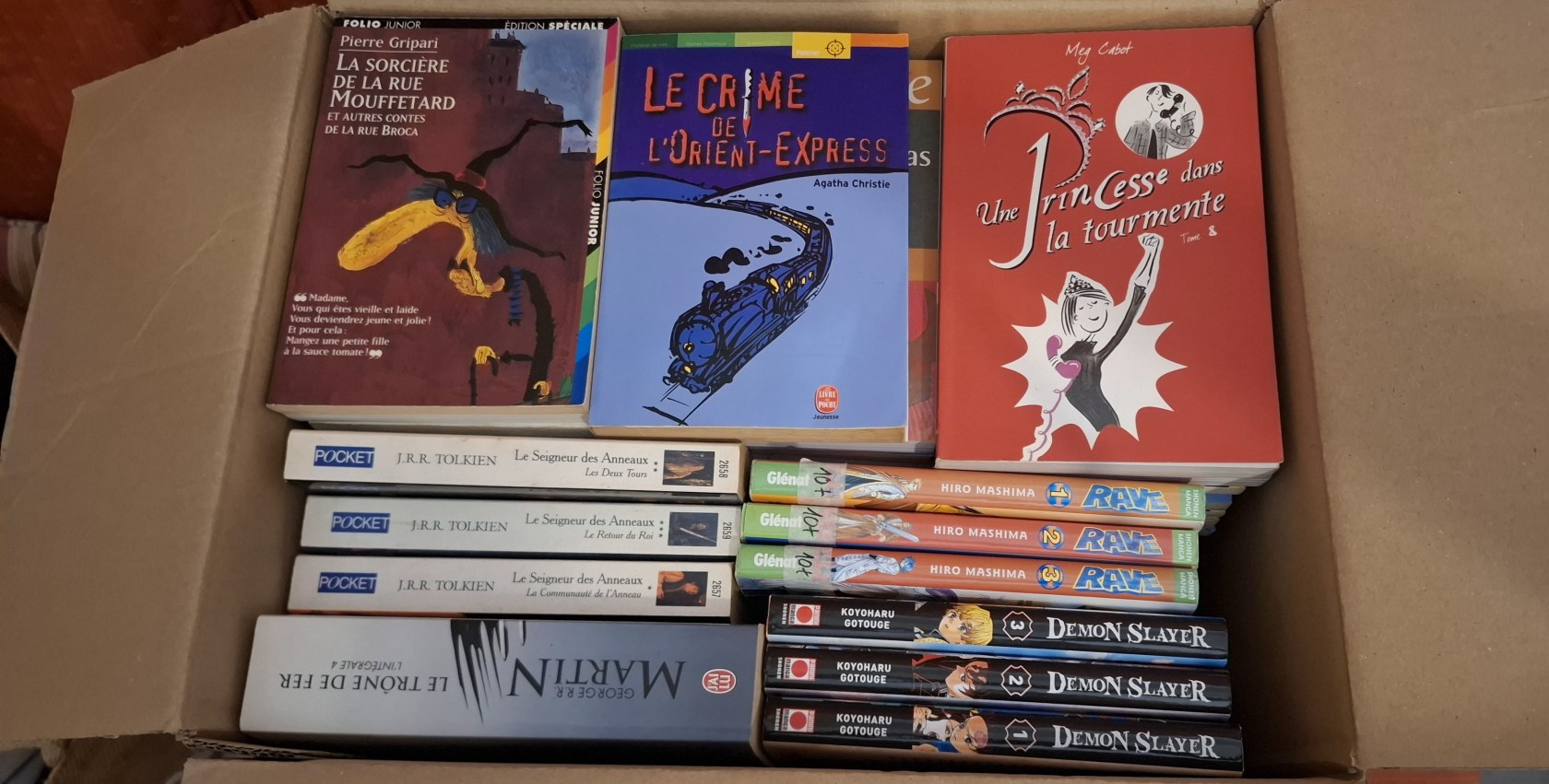 Nous proposons des cartons de livres d'occasion : livres de poche (policiers, romans, bien-être, classiques etc), livres brochés (romans), livres grand format (art, photos, pays, etc), albums ou romans jeunesse