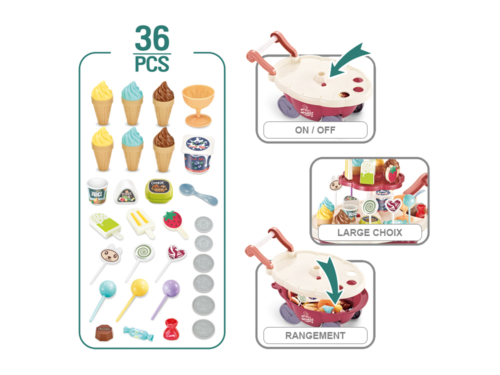 Chariot à Glaces pour Enfant - Effets Sonores et Lumineux, Plateau Pivotant, Rangement Intégré - 36 pièces