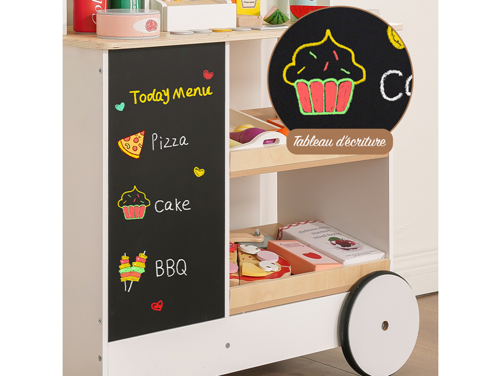 Offrez aux enfants une expérience immersive dans l'univers du commerce avec ce magnifique chariot de snacking en bois ! Ludique et coloré, il est équipé de roulettes, d'un tableau noir effaçable, et d'une caisse enregistreuse, offrant un jeu réaliste et interactif.