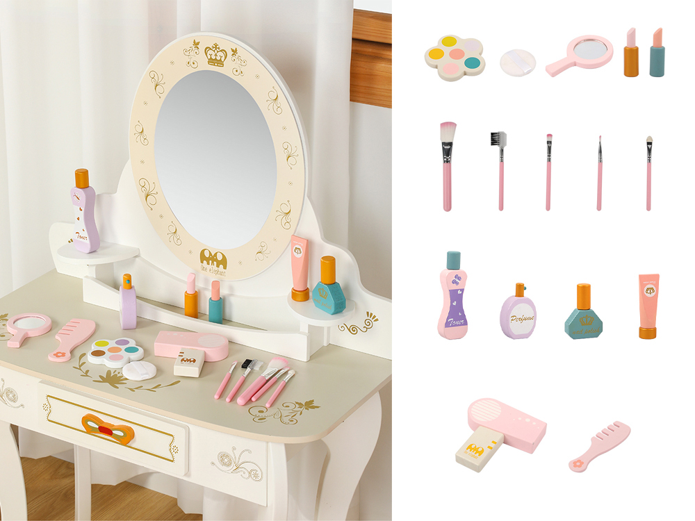 Fabriquée en bois robuste et sécurisé, cette coiffeuse est adaptée aux enfants dès 3 ans et conforme aux normes européennes, garantissant une utilisation durable et sans danger.