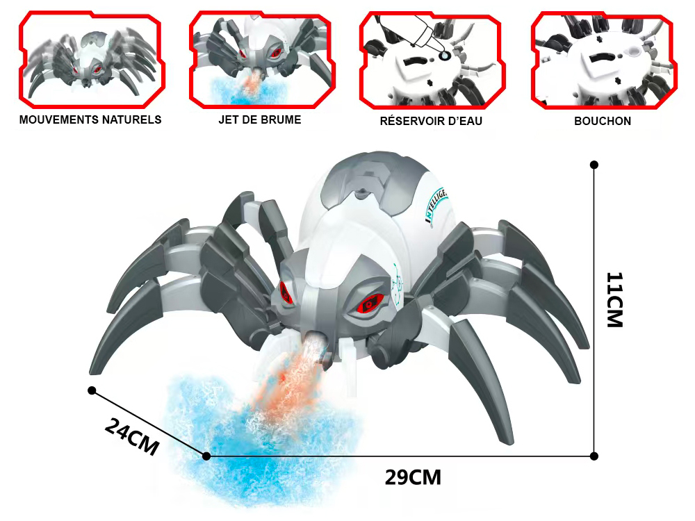 Grâce à sa mécanique de déplacement inspirée des véritables araignées, elle se faufile avec fluidité, avançant et reculant sous votre commande. Remplissez son réservoir d'eau et déclenchez des jets de brume lumineux, offrant un effet spectaculaire et immersif.