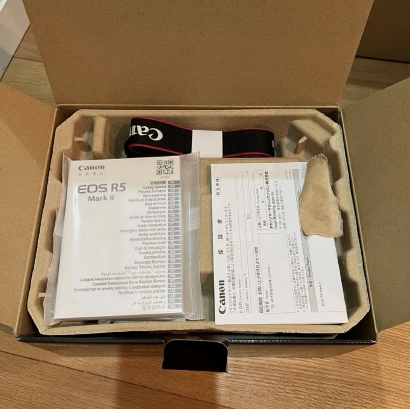 Enjoy professional-quality photography with the Canon EOS R5 Mark II body. This premium mirrorless camera offers advanced features and exceptional image quality, ideal for amateurs and professionals alike. This new and never-used case ensures optimal performance and reliability. It comes with a complete set of accessories, including a user manual, wrist strap, battery, warranty card and receipt, for immediate use.