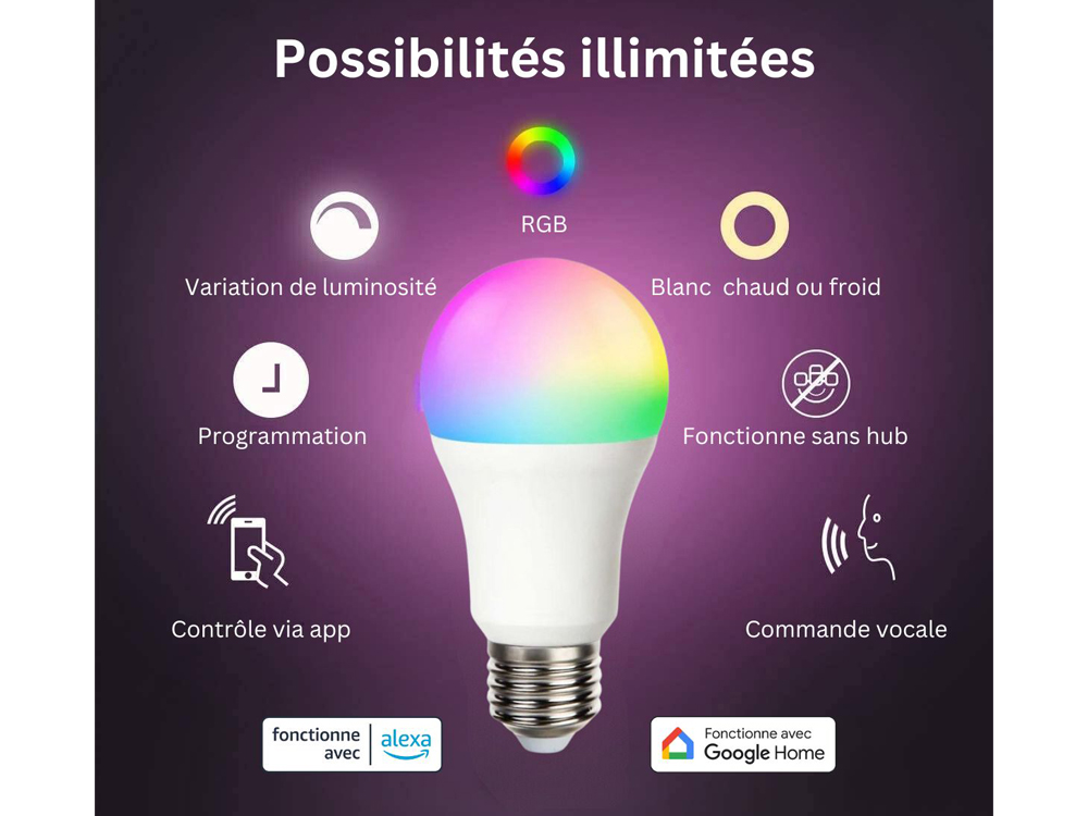 Ampoule Connectée LED 9 W E27 - RGB+Blanc, WiFi & Bluetooth, Contrôle Vocal et Application
