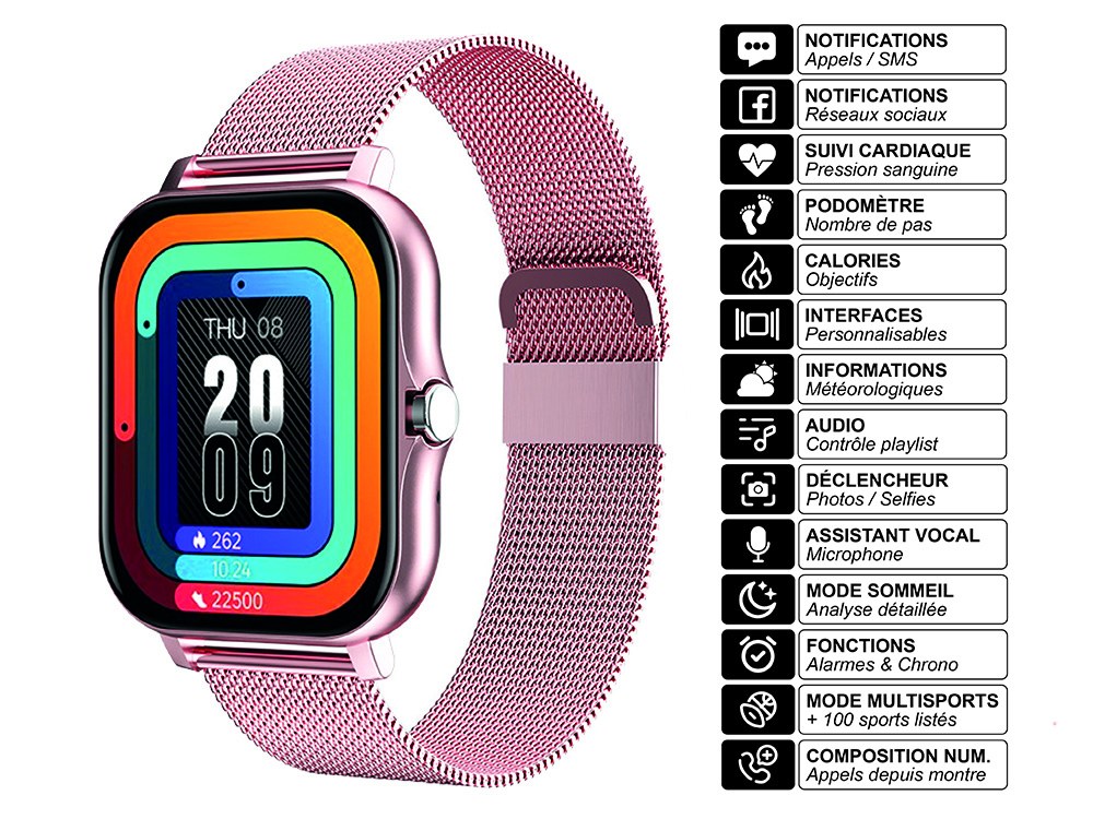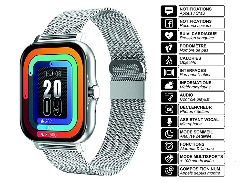 Alliez élégance et performance avec cette montre connectée équipée d'un boîtier en acier et d'un bracelet milanais. Son écran 1,69" lumineux, ses nombreuses interfaces graphiques et ses fonctions santé en font un véritable assistant personnel au poignet.