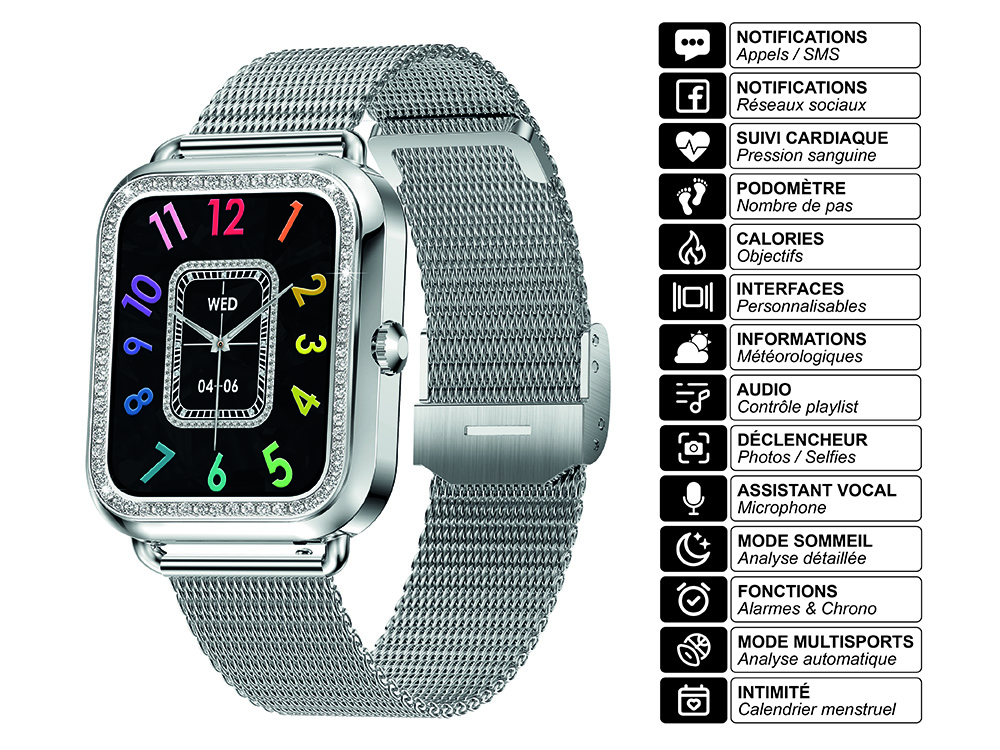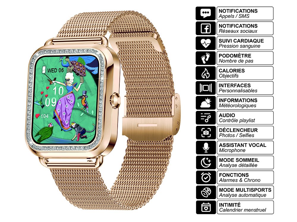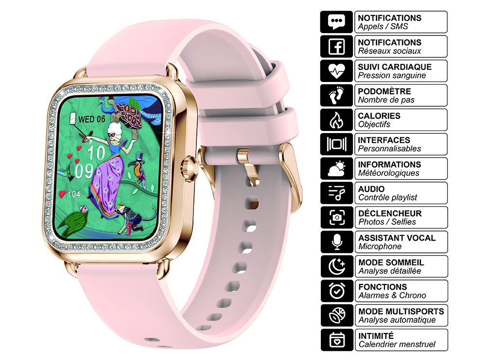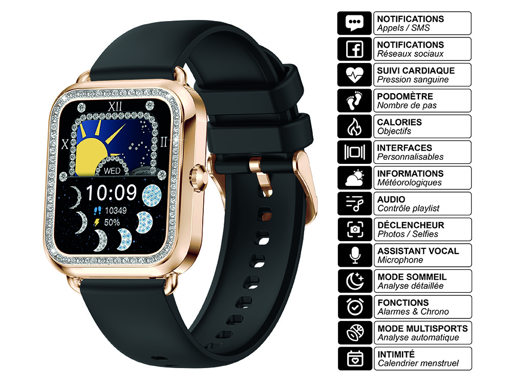 Alliez élégance et technologie avec cette montre connectée pour femme, dotée d'un écran haute résolution et d'un cadran orné de strass. Véritable alliée du quotidien, elle vous accompagne dans votre vie active, sportive et connectée.