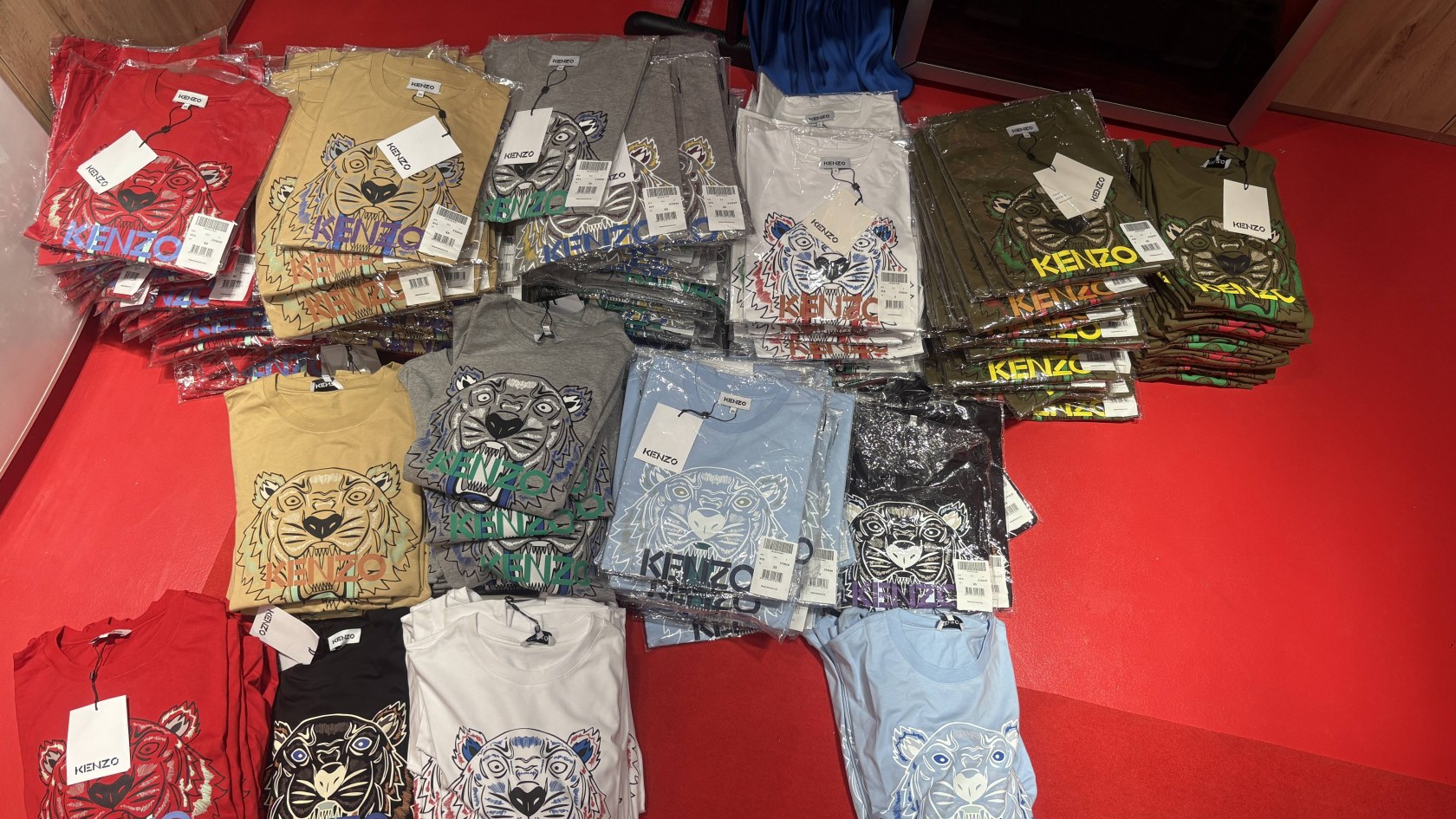 Vente d'un stock de T-shirt Kenzo. Il y a sept couleurs différentes ainsi que des écritures différentes. 350 pièces avec des tailles mixte, proportionnelles allant du XS au XL. Les T-shirts sont originaux, ils viennent directement de la marque Kenzo. Possibilité de racheter une partie du stock. Ils sont à 150 € en magasin, ils sont tous neufs, emballés avec étiquette. Possibilité de venir voir le stock. Contactez-moi au : 06 03 77 82 79