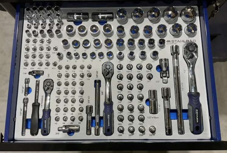 Includes: Complete tool set (sockets, ratchets, chisels, hammers, pliers, screwdrivers, torque wrenches)