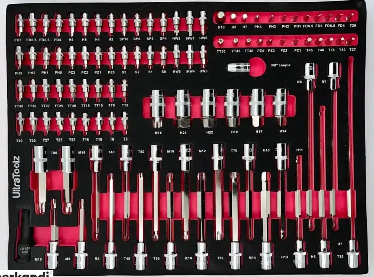 Contains a very comprehensive socket set with power caps, a socket spanner set with ratchet, a very neat pliers set, a nice hex key and torx set, a very comprehensive screwdriver set, a handy metal worktop, and much more!