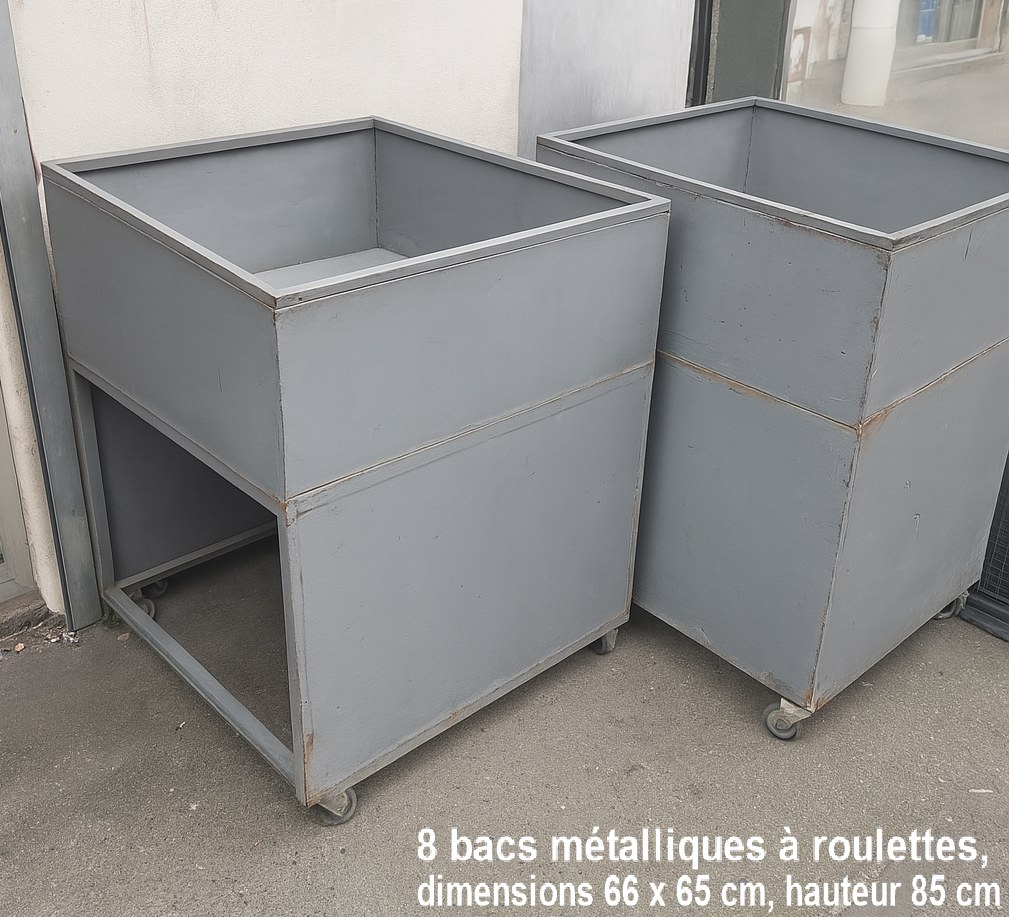 8 bacs métalliques à roulettes, dimensions 66 x 65 cm, hauteur 85 cm / 79 euro pièces