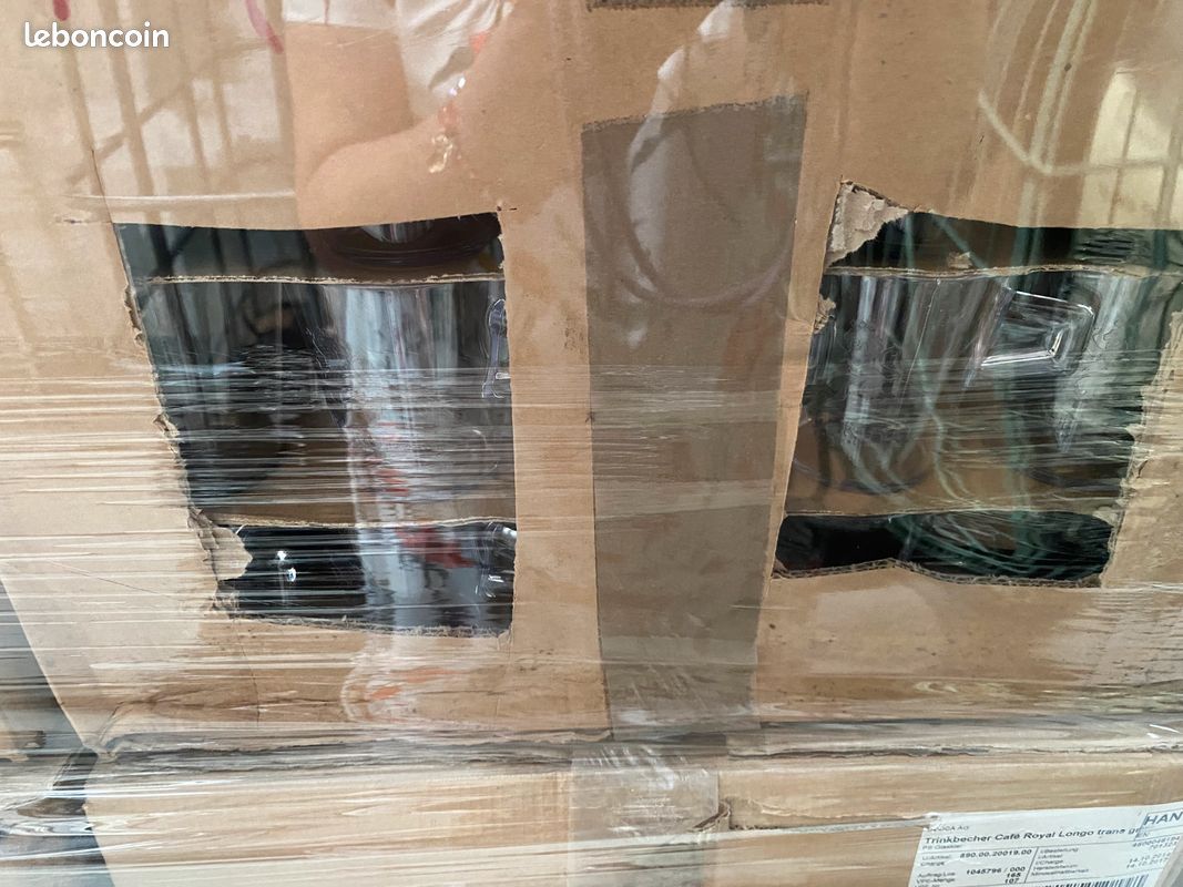 2 PALETTES DE TASSES A CAFE EN PLASTIQUE TRANSPARANT DE : 6 CARTONS DE PETITES TASSES X 336 soit 2016 TASSES 24 CARTONS DE GRANDES TASSES x 165 soit 3 960 TASSES