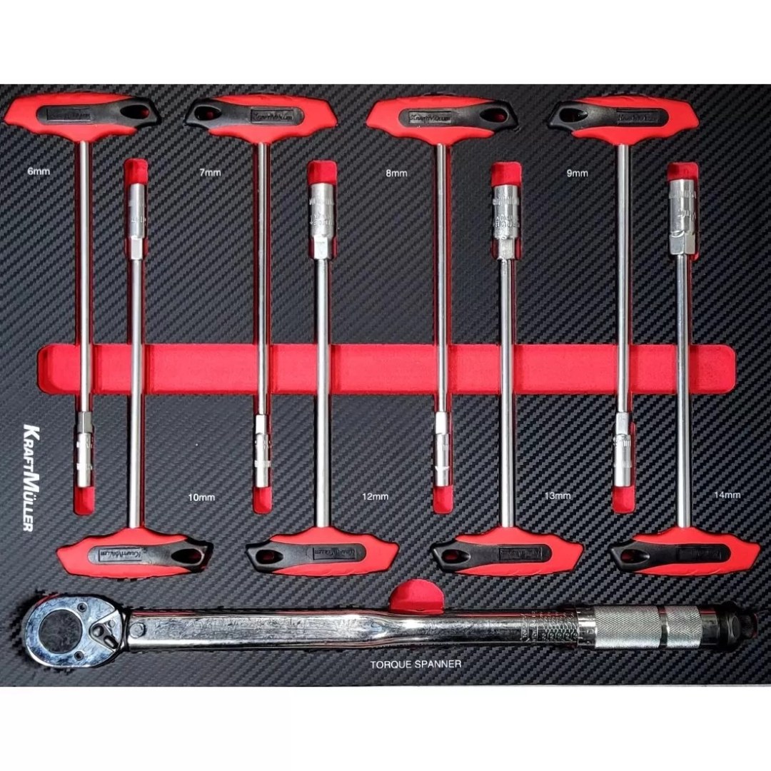Cette servante d'atelier se compose de 7 tiroirs pleins d'outils de qualité professionnelle de la marque de renommée KraftMüller, rangées par types et par tailles dans des compartiments en mousse Eva.