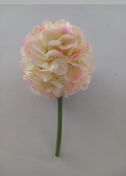 Tête d'hortensia artificielle bicolore rose pâle/beige. Diamètre de la fleur 33 cm, H. 21 cm. Tige armée à mémoire de forme en polyuréthane avec une fleur en polyester. Rendu visuel réaliste. Idéale pour bouquets empreints d'élégance et de solennité.