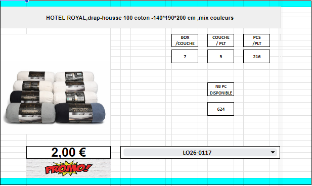 SERVIETTES 100 % COTON à partir de: Gant coloris assortis 100 % coton = 0,25 € pièce Serviette 100 % coton, 30 x 50 cm = 0,37 € pièce Torchon 100 % coton, 50 x 70 cm = 0,50 € pièce Serviette 100 % coton, 500 gr/m² 50 x 100 cm = 1,05 € pièce Drap de Bain 100 % coton, 500 gr/m² 70 x 140 cm = 2.10 € pièce Drap de Bain 100 % coton, 500 gr/m² 100 x150 cm = 3,40 € pièce Maxi drap de Bain 100 % coton, 500 gr/m² 100 x 200 = 4,20 € pièce Peignoir Adulte Col Châle 100 % coton,500 gr/m² =10...