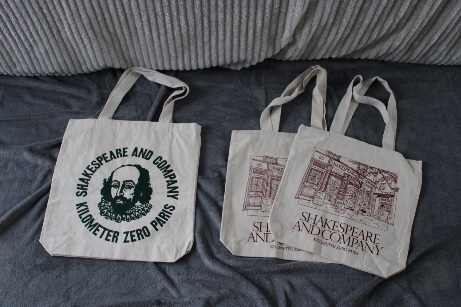 Je propose à la vente un lot de 85 tote bags en coton à l'effigie de la célèbre librairie Shakespeare & Company – Kilometer Zero Paris.