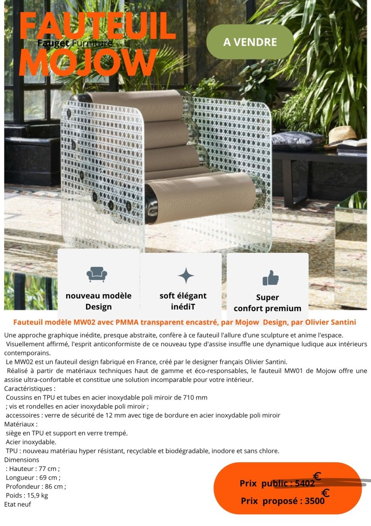 A vendre Fauteuil modèle MW02 avec PMMA transparent encastré, par Mojow