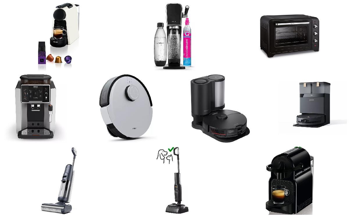 Cet ensemble comprend principalement des appareils pour l'entretien, le nettoyage et la cuisine. Il inclut des aspirateurs et des robots de cuisine parmi d'autres appareils domestiques.