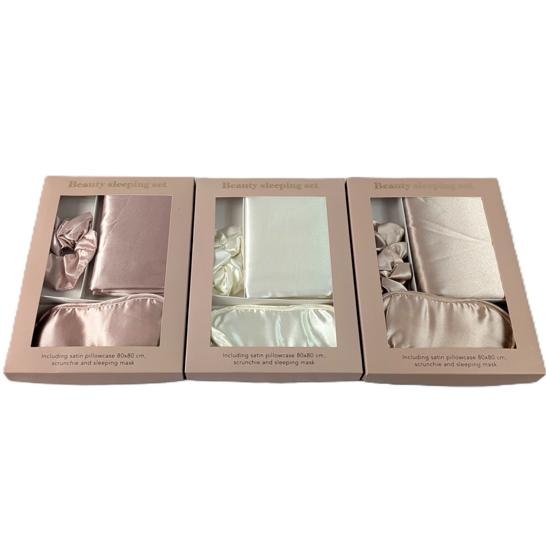Tout ce dont vous avez besoin pour un sommeil confortable et élégant : un chouchou, un masque de nuit et une taie d'oreiller en satin doux pour la peau et les cheveux.
