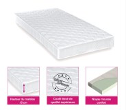 Matelas mémoire de forme. Caractéristiques : - Épaisseur total du matelas : 27 cm - Le mémoire de forme mesure 5 cm d'épaisseurs et à une densité de 24 kg/m². - La mousse du matelas mesure 23 cm d'épaisseurs et à une densité de 55 kg/m² Matelas proposé en trois dimensions différentes...