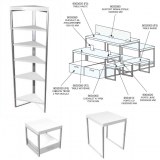 ETAT : NEUF Stock de meubles pour rayonnage en magasin, boutique, garage, école, collectivités, déco. Idéal pour présenter des produits. Matériau : Meubles en MDF bois blanc et pied en Métal Chromé. Dimensions : Existe en plusieurs dimensions Fiche produit dimensions et photos possibles...