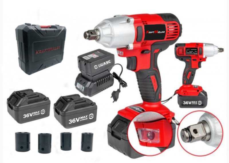 KRAFTMULLER KM-CORDLESS/IMPACT WRENCH/ CLE A CHOC 36V DOUBLE BATTERIES + 4 DOUILLES FICHE TECHNIQUE: 36V /0-2200rpm/300N.M 2battery 3.0Ah Forward/reverse rotation Max 280N.M torque force Ergonomic switch Powerful motor for long time use Convenient carrying case 1 hour quick recharge...