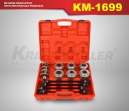 ENSEMBLE DE MANCHONS À PRESSER ET À TIRER Ensemble universel (28 pièces) pour le remplacement des silentblocs, roulements, bagues. Grâce à différents boulons d'ancrage, mandrins et butées par taille, il est applicable à la plupart des voitures. L'ensemble comprend 20 mandrins de...